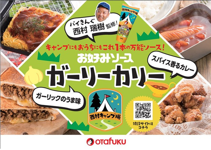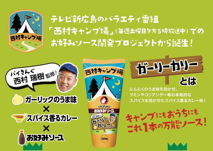 ついに【 オタフクソース × 西村キャンプ場 】の コラボ お好みソース 「 ガーリーカリー 」が完成!にんにくのうま味とクミンやコリアンダーなどのスパイスが効いた 本格的 な カレー味 で キャンプ 飯 を楽しめる お好みソース です。<br>